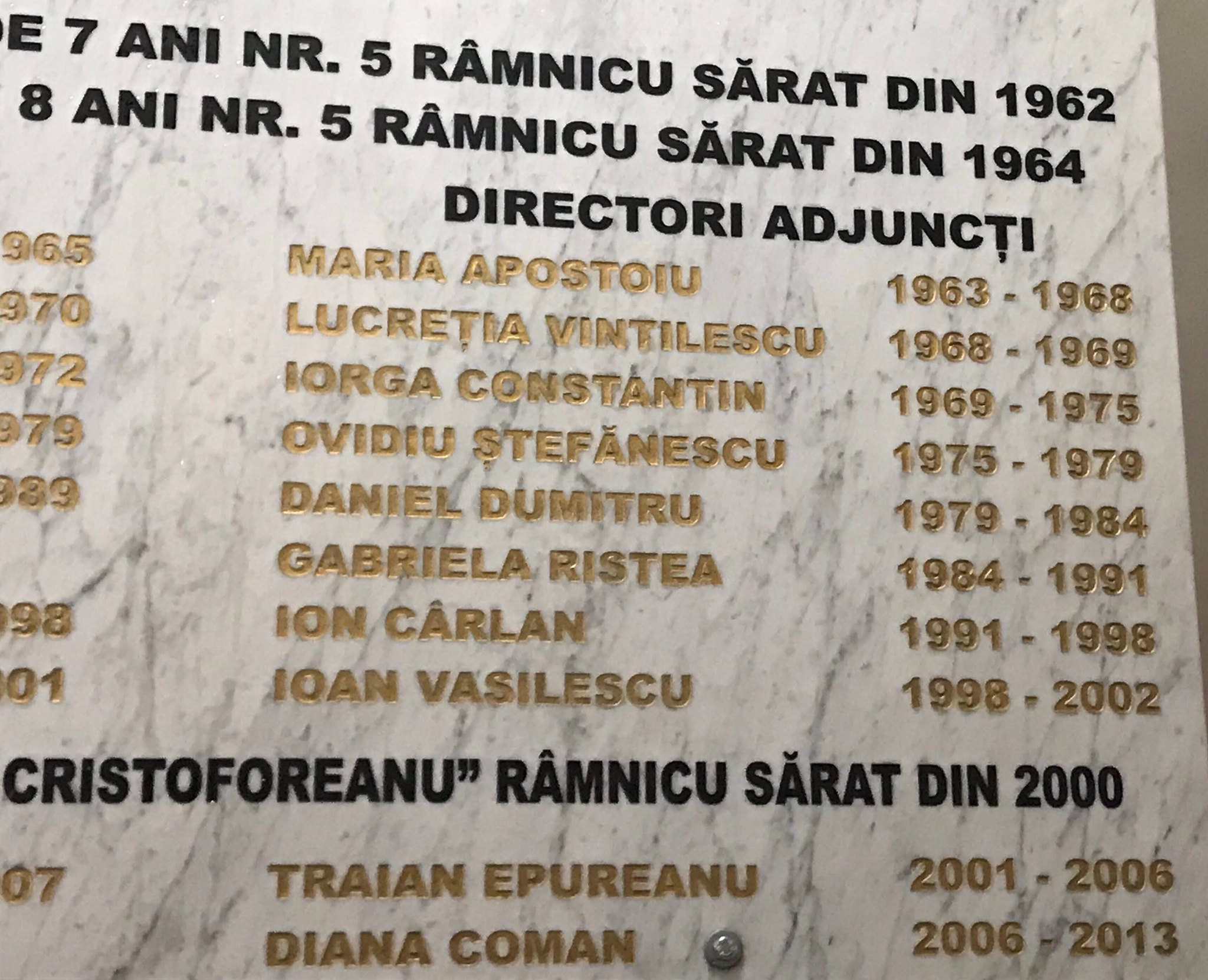 Marți, 29 noiembrie 2022, am luat parte, la invitația directorului Ionel Meiroșu, la ceremoniile dedicate aniversării celor 150 de ani de existență a uneia dintre cele mai vechi și mai prestigioase instituții de învățământ din județul Buzău, Școala Gimnazială „Vasile Cristoforeanu” din Râmnicu Sărat. Au fost dezvelite un bust al fondatorului, Vasile Cristoforeanu (1859-1896), primar al orașului Râmnicu Sărat, și o placă comemorativă dedicată foștilor directori ai școlii. La festivități au luat parte: Daniel Țiclea, prefectul județului Buzău; Sorin Valentin Cîrjan, primarul orașului Râmnicu Sărat; senatorul Vlad Pufu; Părintele Cristian Asănache, protopopul de Râmnicu Sărat; foști directori, profesori și elevi, actuale cadre didactice ale gimnaziului.